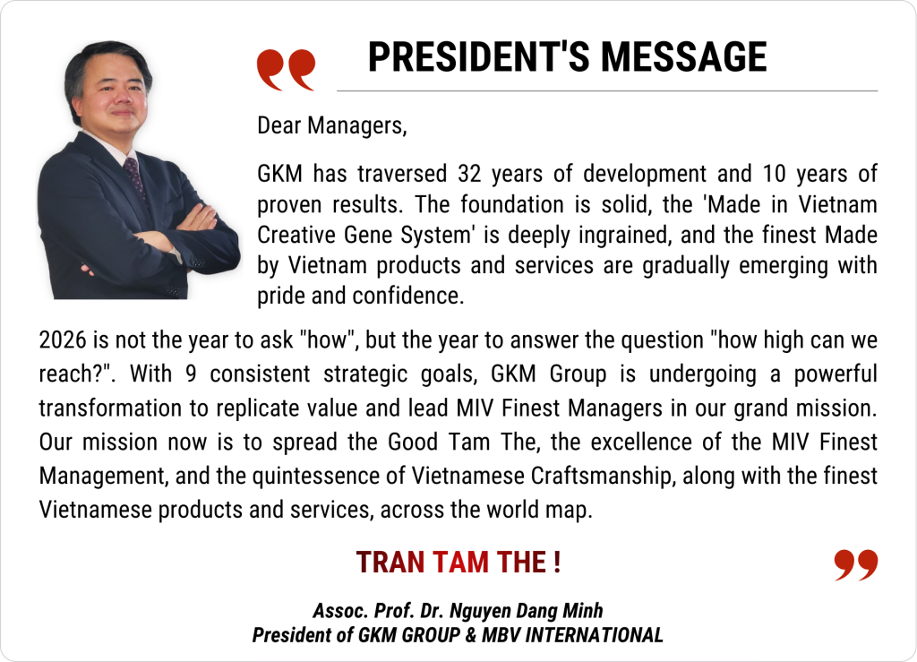 The journey ahead in 2026 is not just the story of GKM GROUP alone. It is a call to action to the business community, managers, educators, and international partners who share the same “Tam The”: Let’s join forces, support each other, and create together. Together, we will build a self-reliant economy where Made by Vietnam businesses thrive through intelligent management, cultural identity, and products and services that constantly strive for even higher standards of excellence.