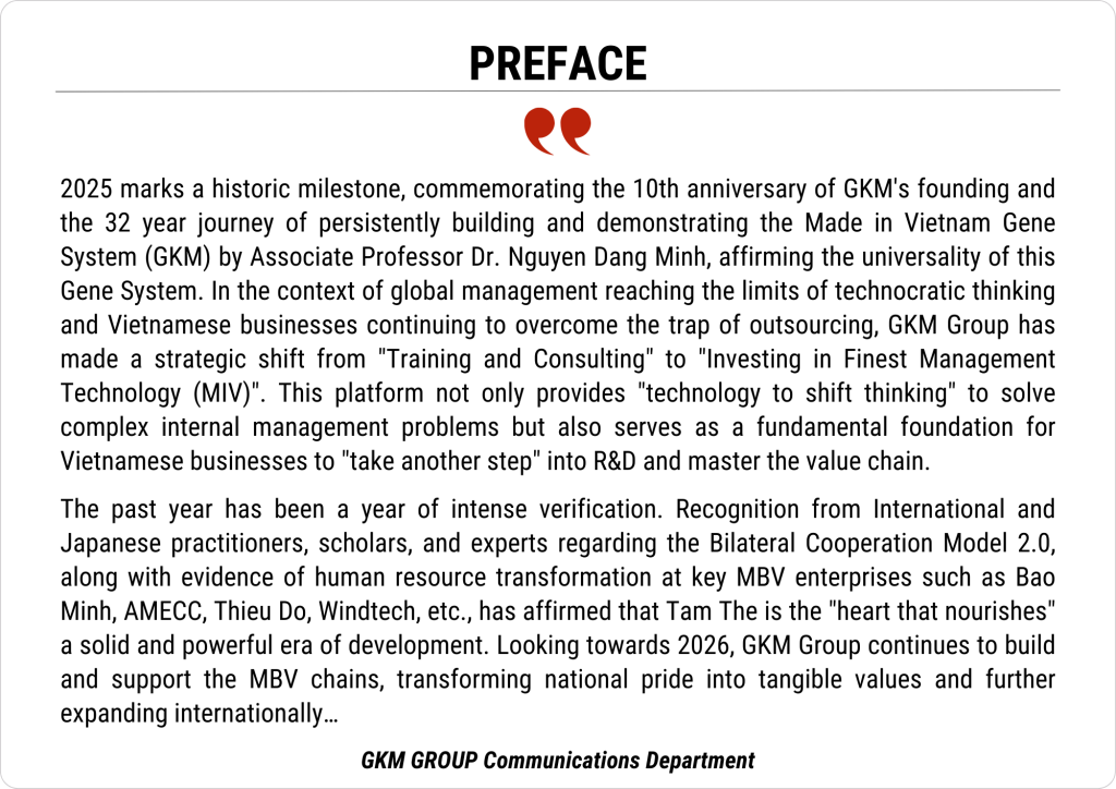 Looking back at the journey towards 2025, GKM GROUP is proud to have completed the fundamental pieces to shape a synchronized and comprehensive Made in Vietnam Innovation Ecosystem. From the pillar of academic research (GKM FINEST), the international academic network (GKM INTERNATIONAL), the intergenerational education system (GKM EDU), to the key business alliance (MBV ALLIANCE) and its integration into the family unit (GKM HOMES); all operate on the foundation of the Made in Vietnam Innovation Gene System.