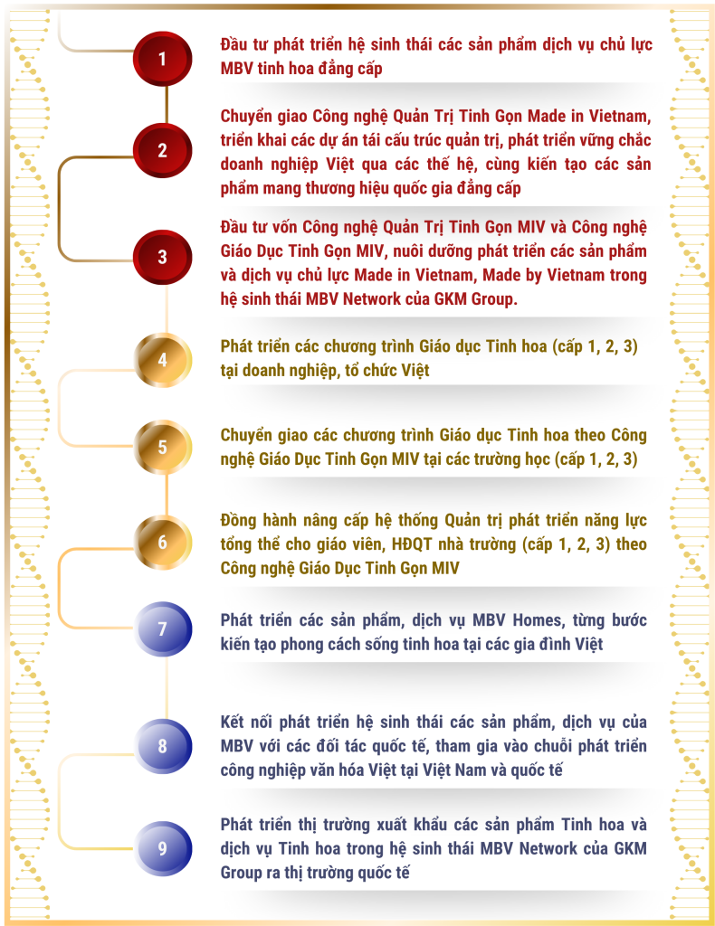 Từ sự chuyển hóa trong tâm thức con người, GKM FINEST bước sang giai đoạn thổi hồn văn hóa vào vật chất, biến các tài nguyên bản địa thành những tác phẩm MBV Tinh hoa thông qua cơ chế hợp lực của 5 lĩnh vực trụ cột gồm Giáo dục, Công nghiệp, Nông nghiệp, Du lịch và Y tế.