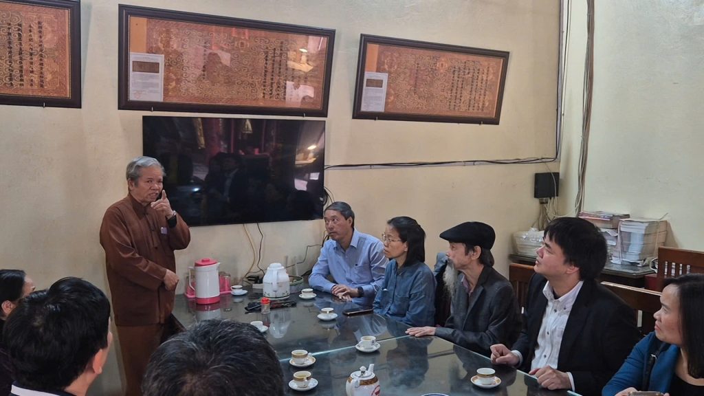 Các doanh nhân MBV lắng nghe ông Thủ Từ kể lại thần tích Chủ Đồng Tử, Tiên Dung tại Đền Hóa Dạ Trạch (Ảnh: GKM)